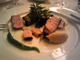 長野の『幻豚』という豚の料理、りんごベースのペーストを付けて